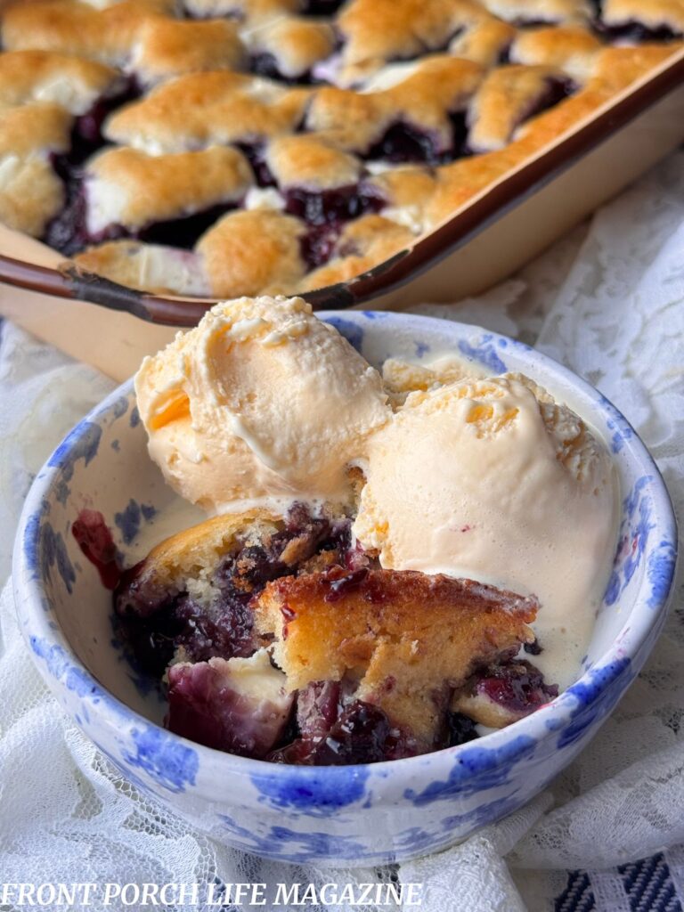 Cobblers are very popular in the South. They are pure comfort and very simple to prepare. This blueberry cream cheese cobbler is no exception. We always made this delicious cherry cream cheese cobbler, so we thought….let’s do blueberry! Most people don’t add cream cheese to a cobbler, but listen…it works! It also adds a level of creaminess that is so good! This really is one of those dessert recipes that surprises people with just how good it is.