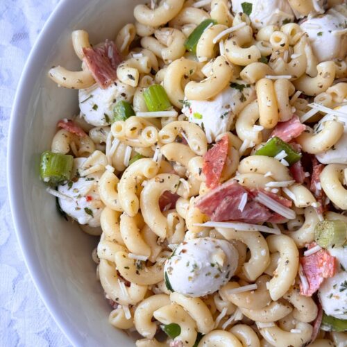 This easy Italian pasta salad comes together so quickly! Full of salami, pepperoni, mozzerella and pasta…it’s full of flavor and always a hit!